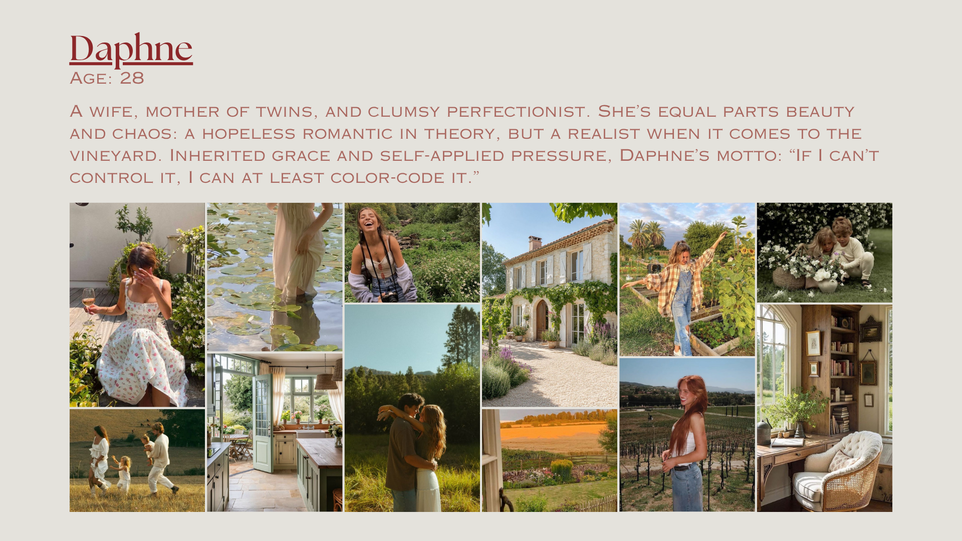 A collage with nine photos of a woman named Daphne, her family, and her surroundings, including nature, a house, and indoor scenes, with a text description about her age and personality.