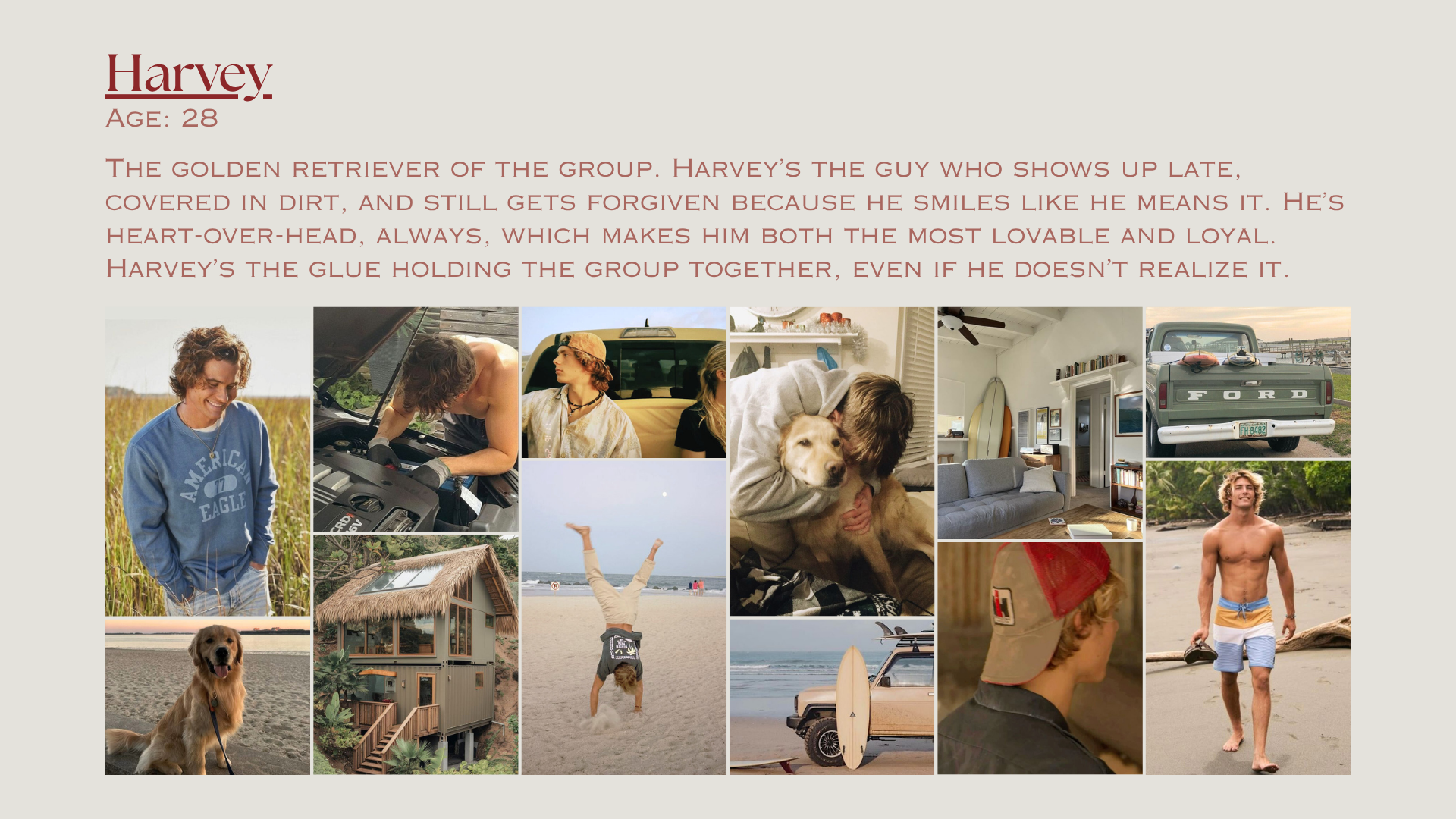 Collage of beach, outdoor, and home scenes with a young man, dogs, a woman, cars, a house, and a person doing a handstand on the beach.