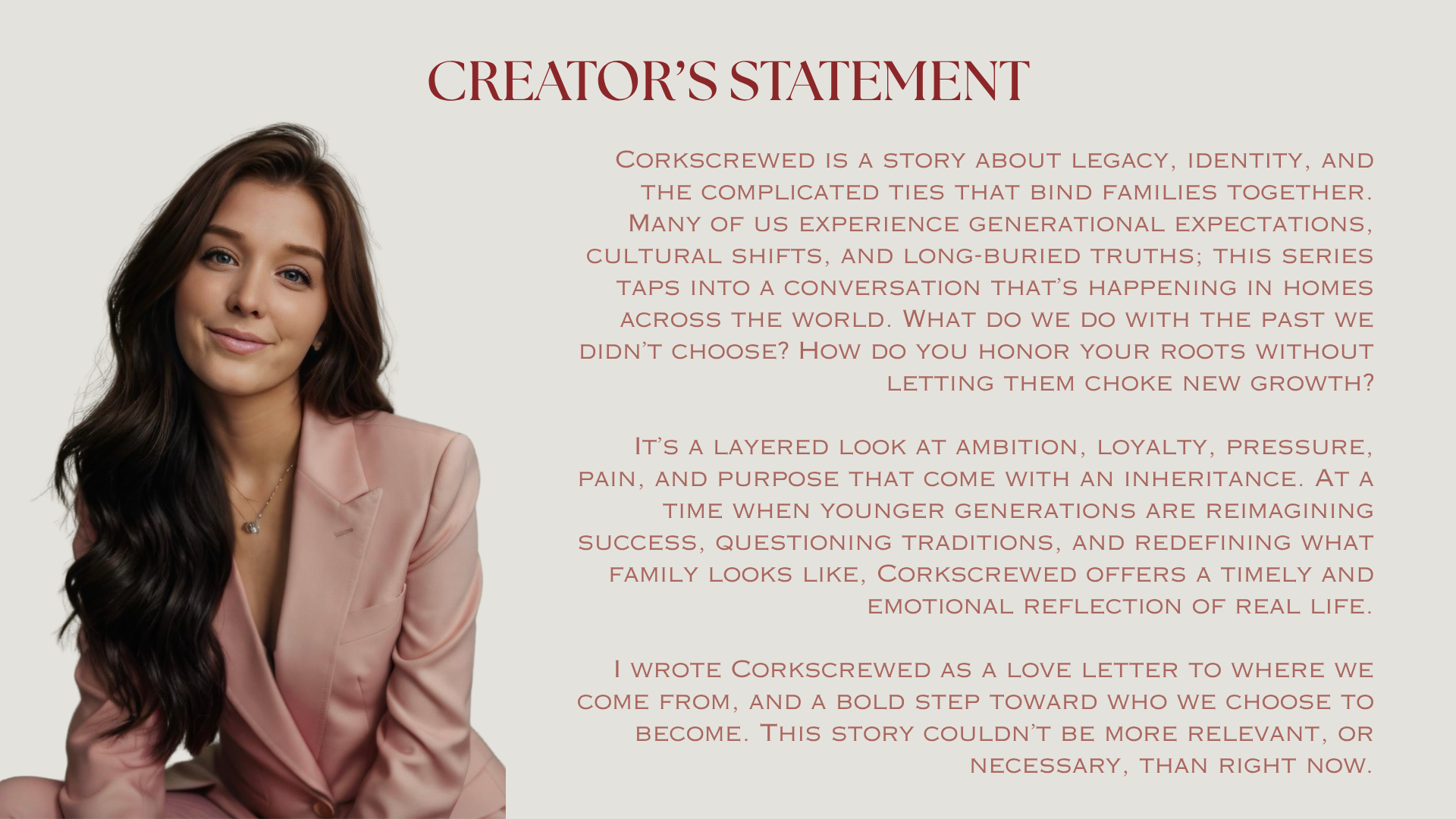 A woman with long dark hair dressed in a light pink blazer, sitting and smiling softly, with text about the creator's statement on the right side.